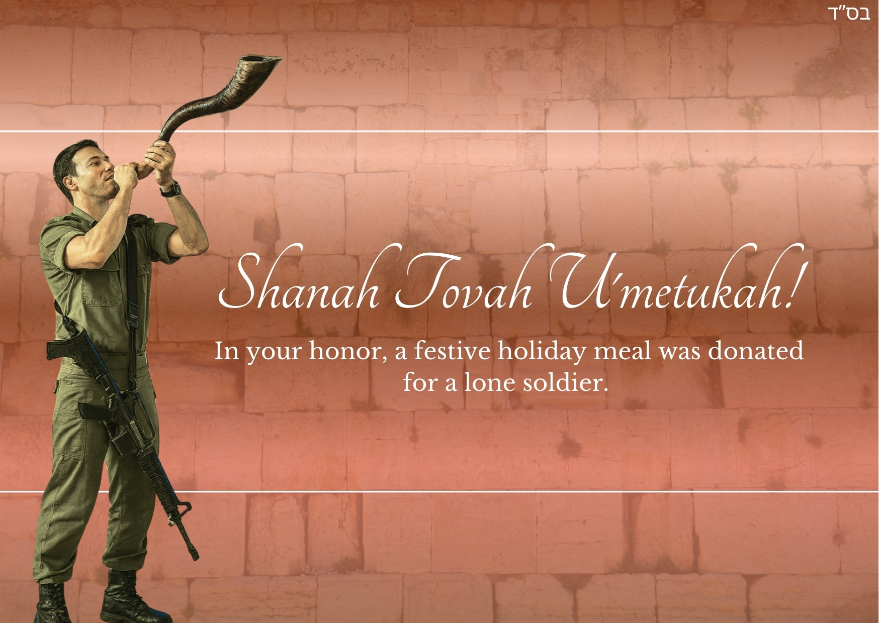 Send a personalized Shana Tova e-card. Your gift provides one Rosh Hashanah meal for a lone soldier.